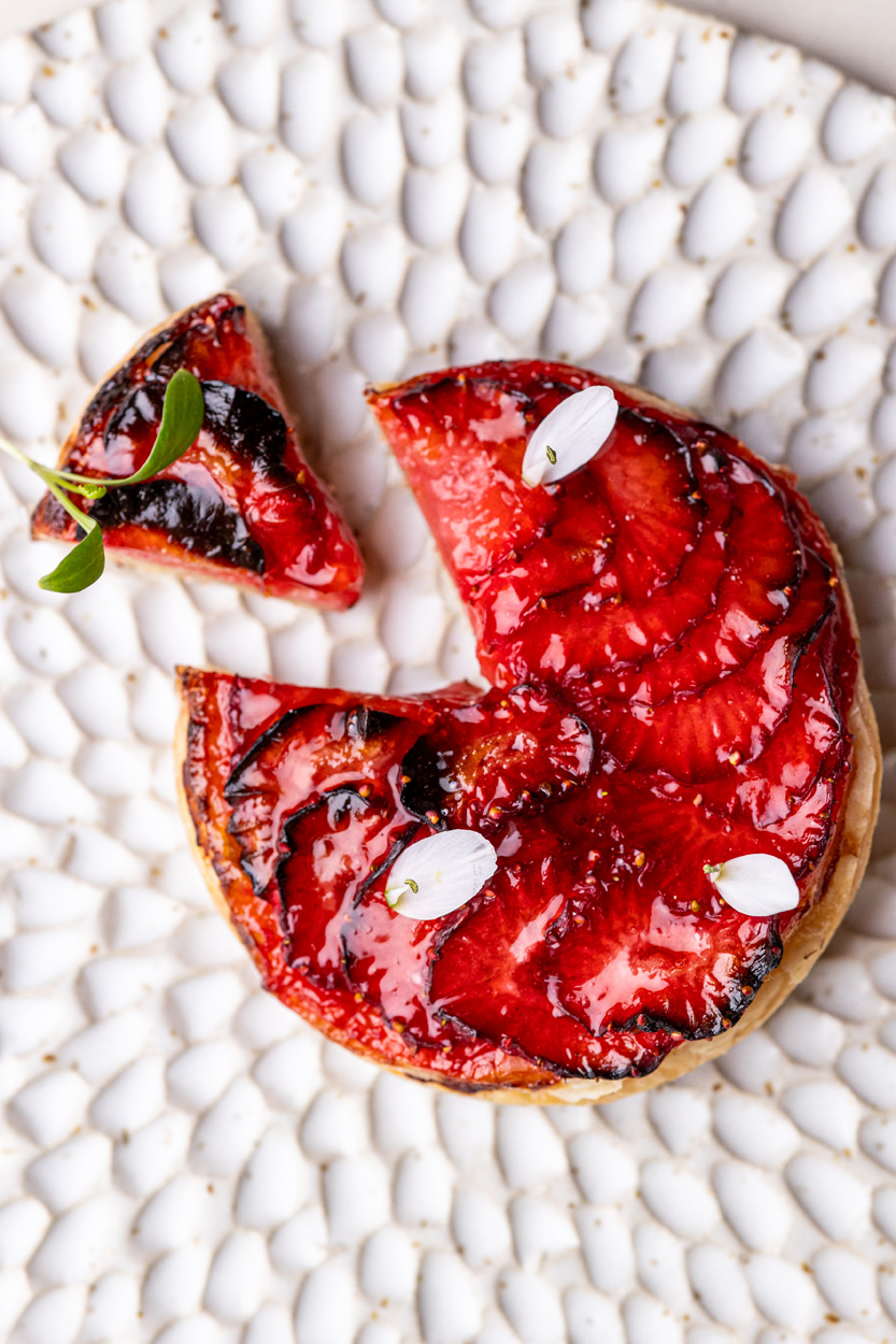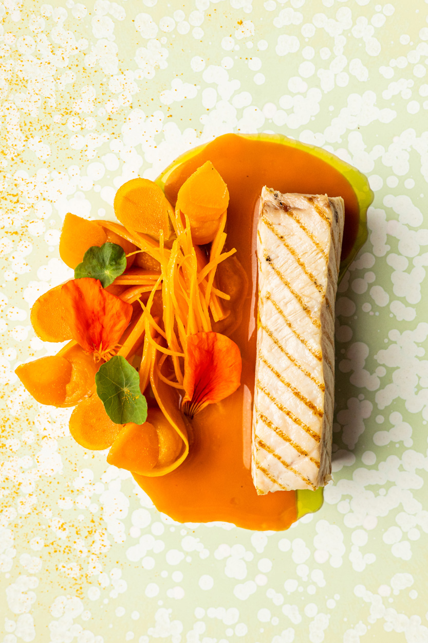 Rouget de Méditerranée à la flamme, fenouil confit, gnocchi à l’ail noir et fumet de poissons lié à la rouille